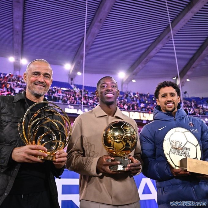 巴黎晒恩里克、登贝莱、马尔基尼奥斯+三奖项合影:集体的力量