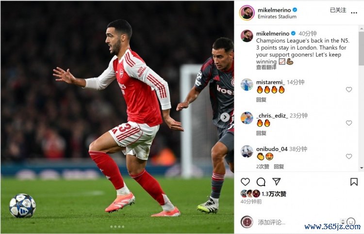 阿森纳中场梅里诺社媒晒出比赛照片, 足球快讯足球直播并写道:“欧冠重回北五区, 毕尔巴鄂竞技将3分留在伦敦。”