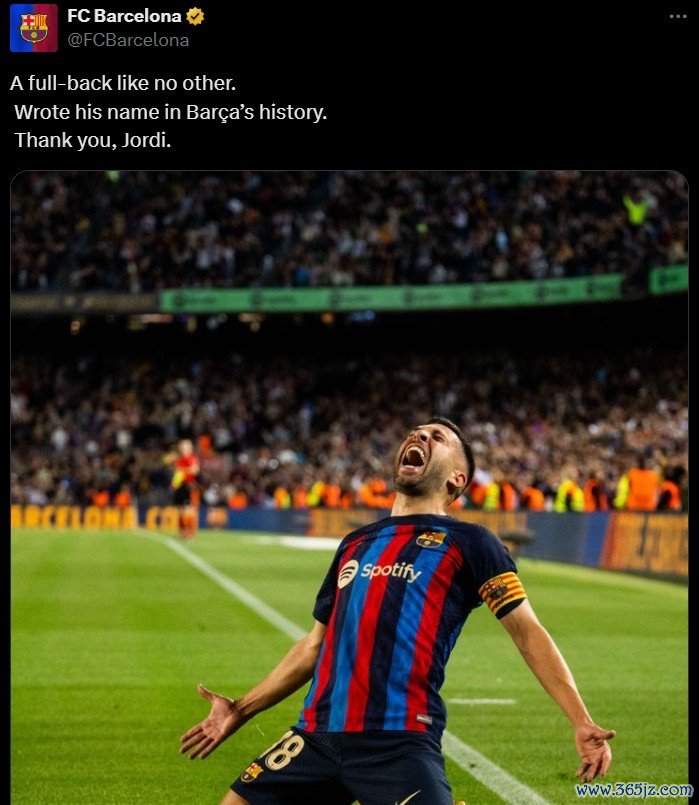 巴萨官方写道:“一位与众不同的边后卫。在巴萨历史上留下了自己的名字。谢谢你,畅游运动天地体育直播乔迪。”