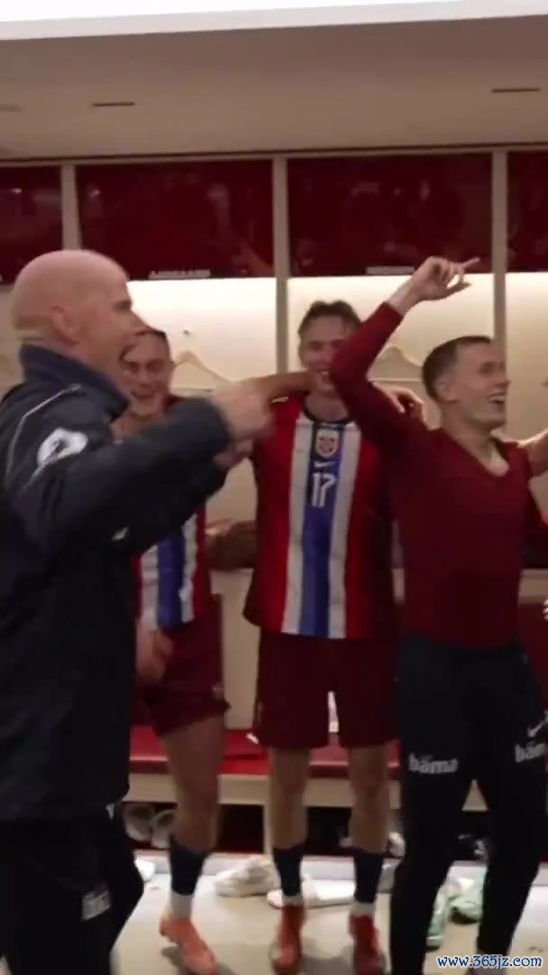 10月12日讯 本轮世预赛挪威5-0狂胜以色列,最快下轮可锁定世界杯正赛门票,畅游运动天地足球直播赛后挪威全队在更衣室纵情庆祝, 足球快讯受伤的队长厄德高只能坐在座位上和队友一起嗨。
