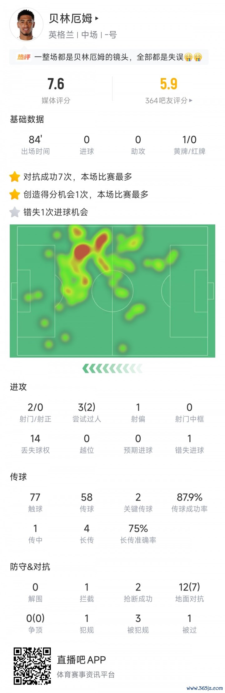 斩获MVP!贝林创造1机会+2关键传球12对抗7成功,评分7.6全场第3
