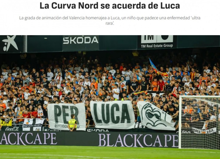足球是让媒体没有关注的社会议题获得可见度的强大传声筒,今天在梅斯塔利亚球场,由瓦伦西亚北看台球迷组织发起,人们为罹患极罕见疾病的男孩卢卡发声。