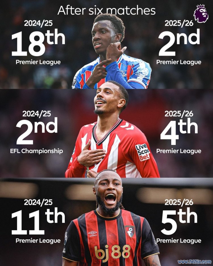 9月28日讯 英超官方更新社媒动态,畅游运动天地直播吧称赞水晶宫、桑德兰、伯恩茅斯本赛季的表现。