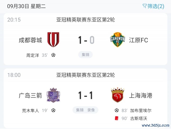 09月30日讯 亚冠精英职业联赛 东亚区第2轮,成都蓉城1-0击败韩国球队江原FC,畅游运动天地NBA直播取得中超球队在本届亚冠精英/二级职业联赛 正式比赛的首胜, 足球快讯4支中超球队目前战绩为1胜2平3负。