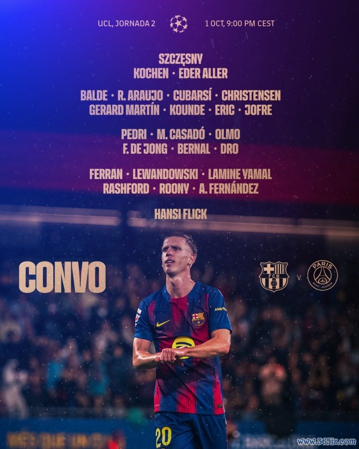 10月01日讯 巴萨公布欧冠对阵巴黎的大名单,莱万、亚马尔、佩德里领衔, 足球快讯NBA直播巴尔德复出, 毕尔巴鄂竞技一线队守门员仅什琴斯尼。