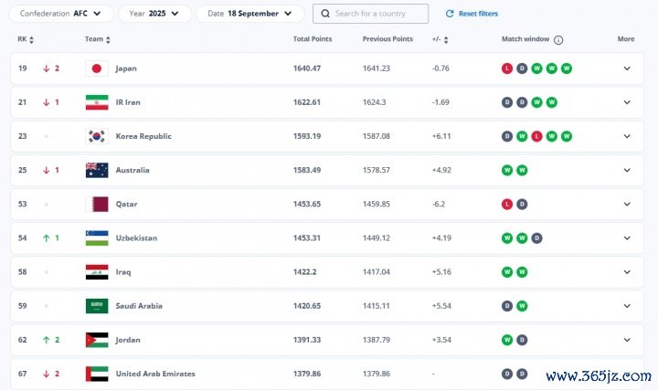 符合排名无意外!FIFA亚洲前十:8队直通世界杯赛 ,剩余2队踢附加赛