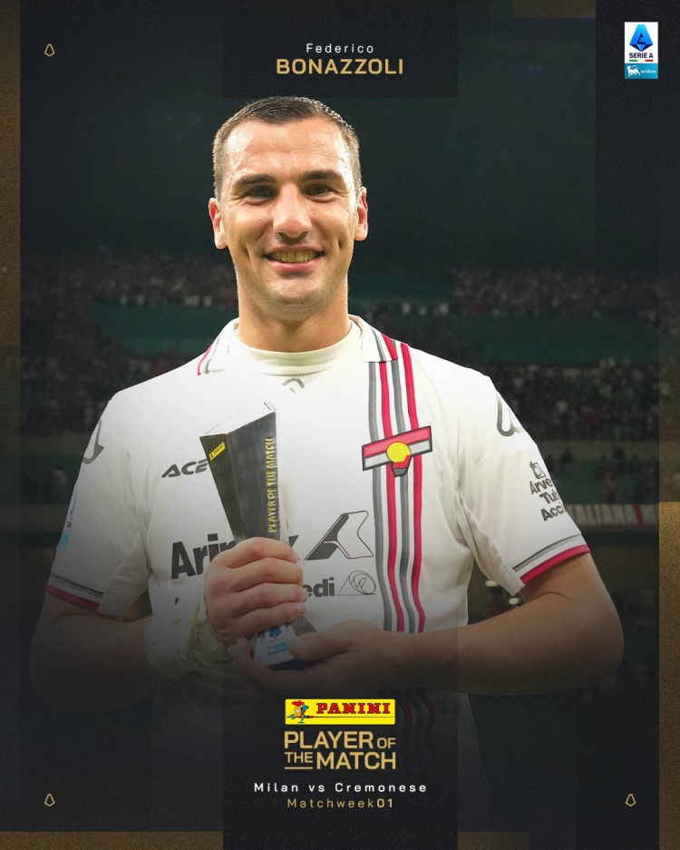 8月24日讯 2025-26赛季意甲首轮,克雷莫纳客场应战 2-1爆冷击败AC米兰。赛后,本场赛事 凌空破门的博纳佐利当选全场最佳球员。